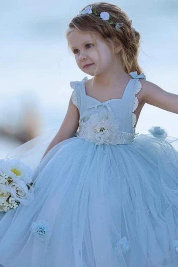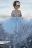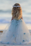 Blue Round Neck Ball Gown Tulle Sleeveless Flower Girl Dresses APF0011