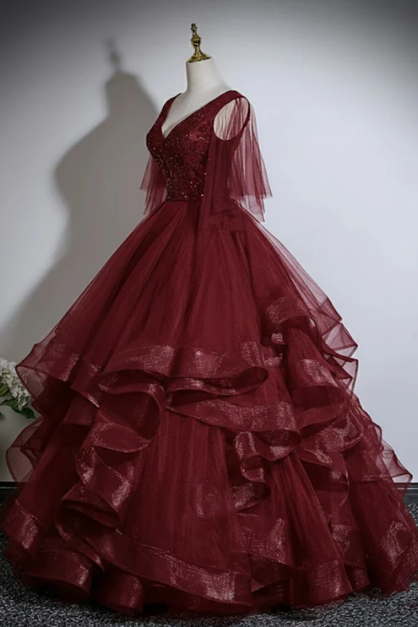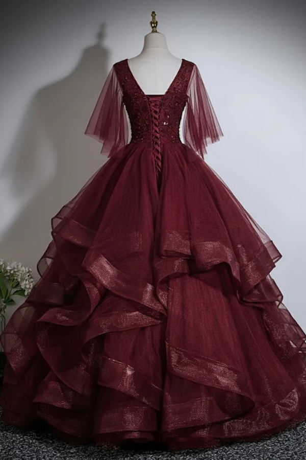 Wine Red Tulle Ball Gown Prom Dress with Flutter Sleeves, V Neckline Long Party Dress APP1311
