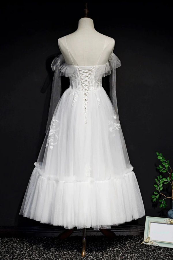 White Lace A Line Tea Length Prom Dress, Simple Wedding Dresses APP0865
