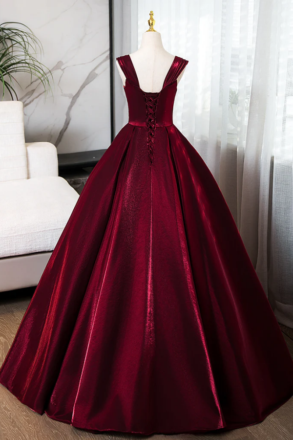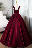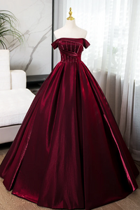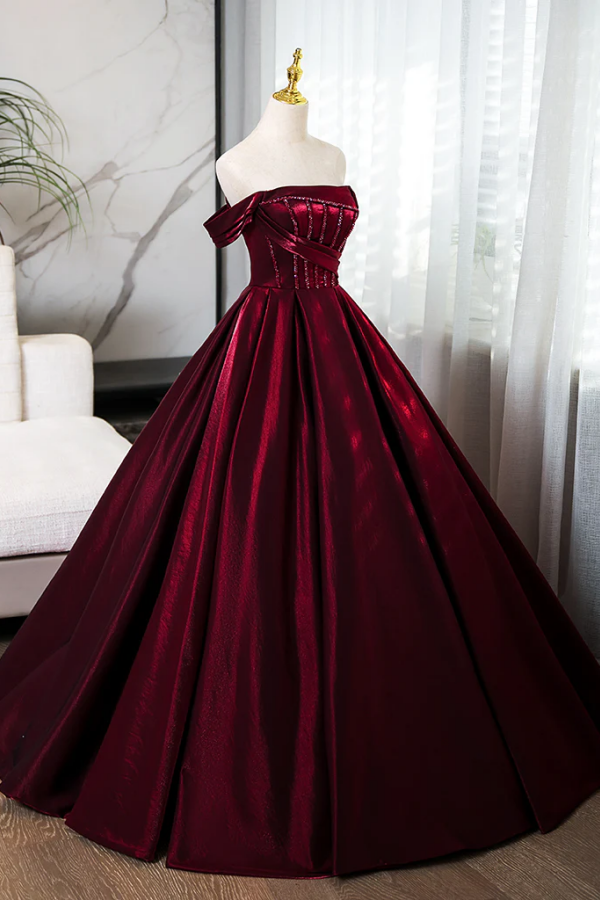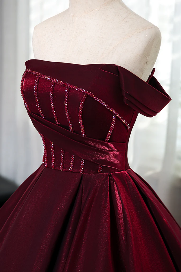 A Line off Shoulder Satin Burgundy Long Prom Dress, Burgundy Evening Dress with Beads APP1038