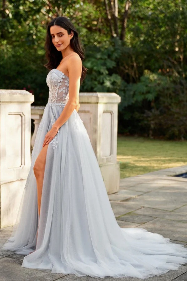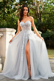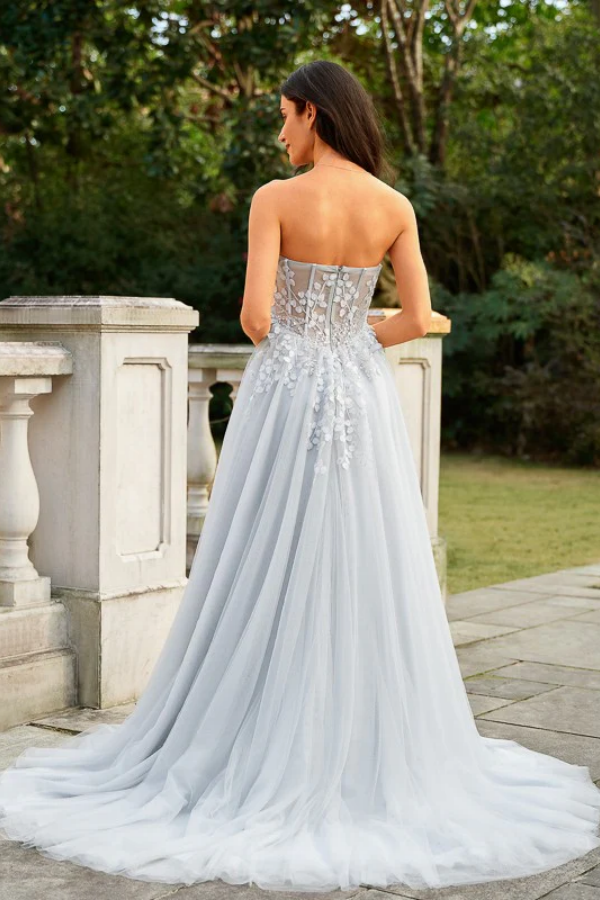 Beautiful A Line Princess Tulle Applique Sweetheart Sleeveless Court Train Prom Dresses APP1027