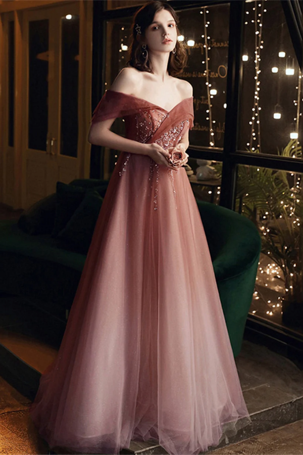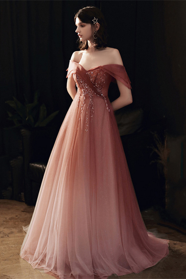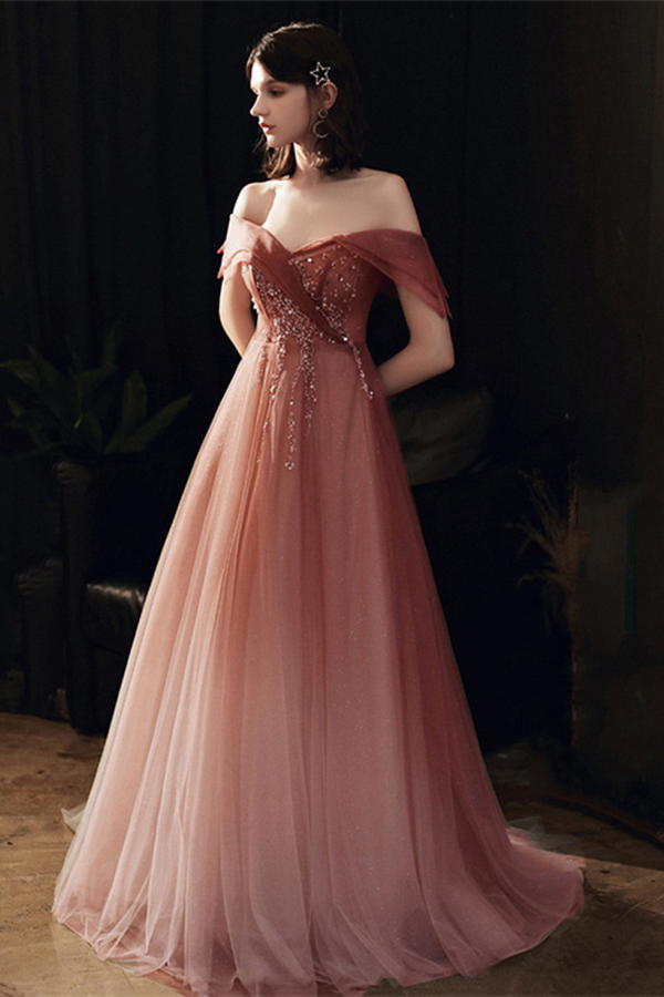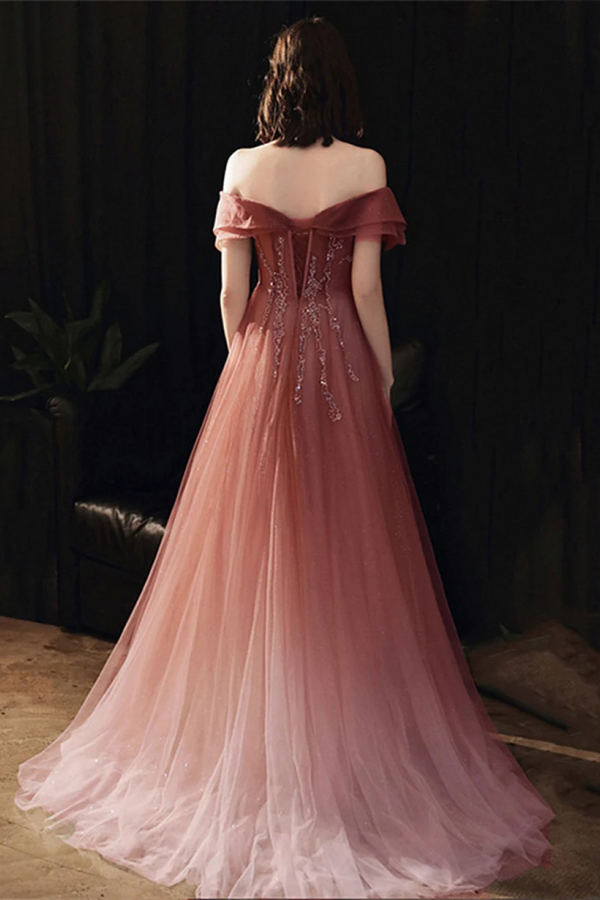 Lovely Pink Gradient Tulle Beaded Off Shoulder Party Dress, Pink Long Prom Dress APP1005