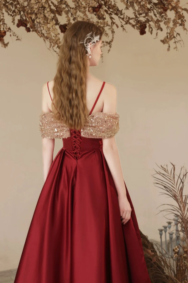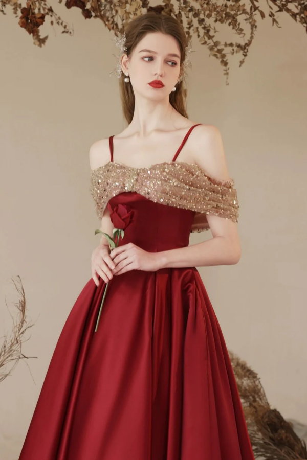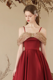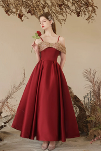 A Line Off Shoulder Sweetheart Neck Tea Length Burgundy Prom Dress APP1083