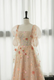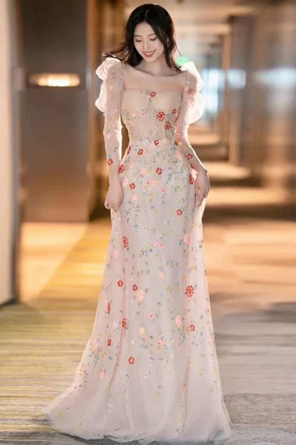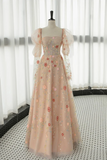 A Line Long Sleeve Champagne Pink Lace Long Prom Dress APP1122