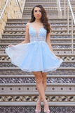 Anneprom Cute V Neck Light Blue Lace Floral Short Prom Homecoming Dresses APH0154