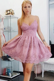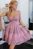 Anneprom Pink Tulle A line V neck Lace Spaghetti Straps Short Homecoming Dresses APH0157