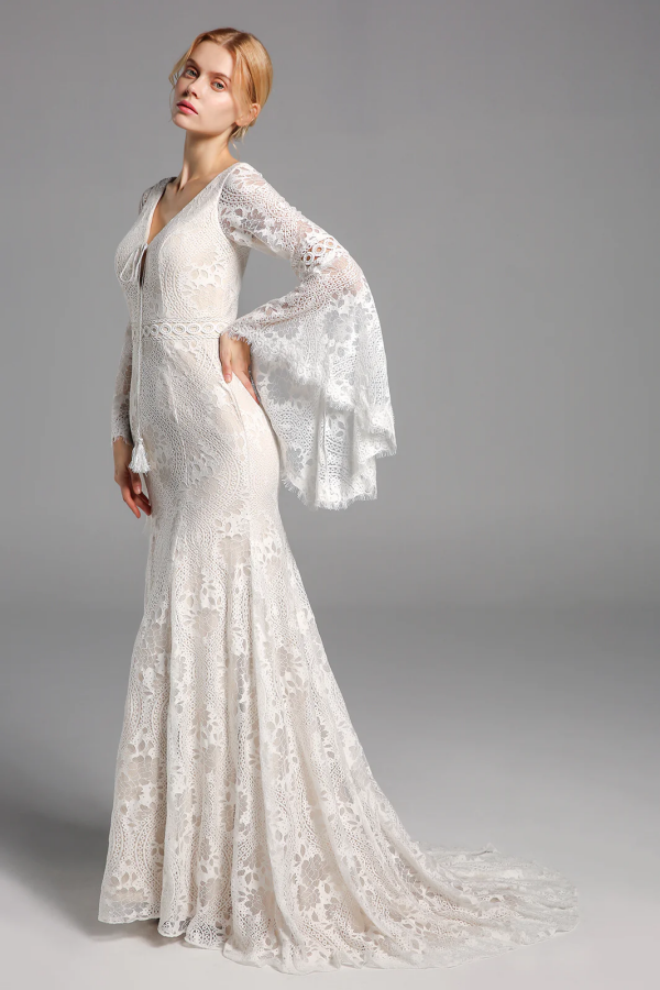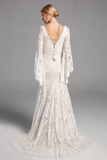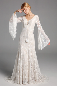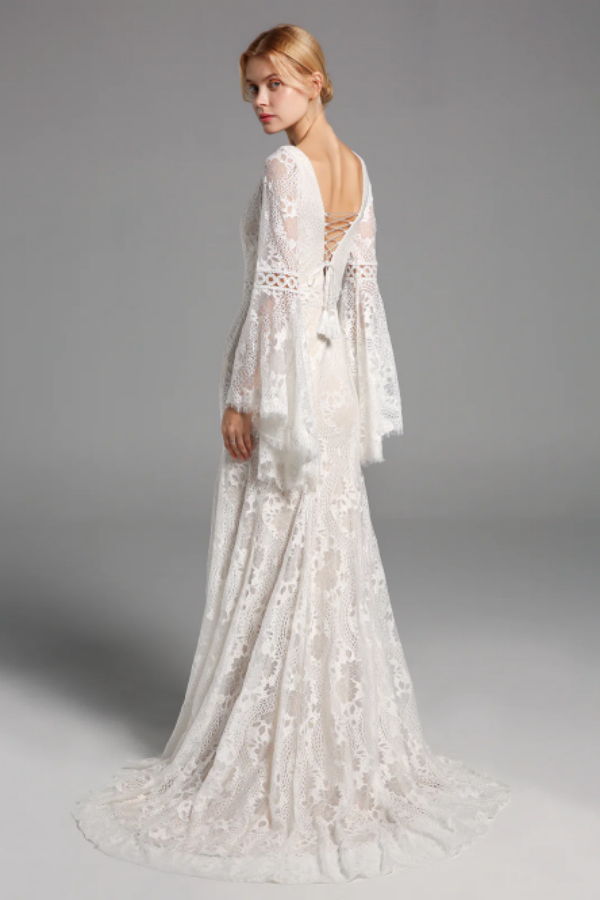 Chic Elegant Boho Lace Long Beach Wedding Dresses With Sleeves APW0426