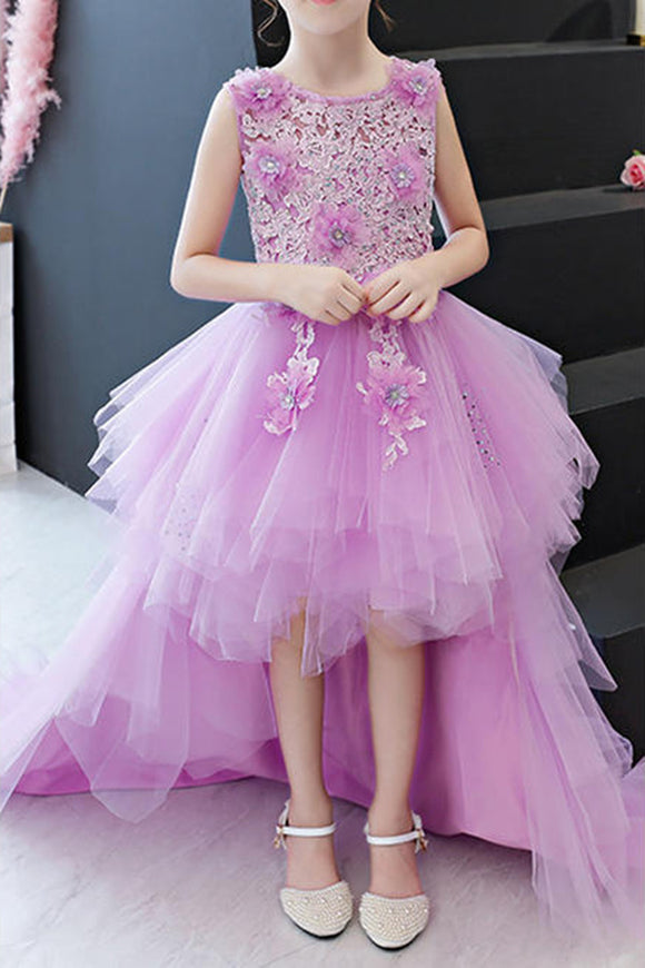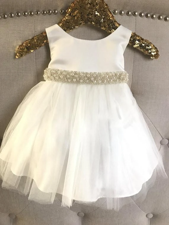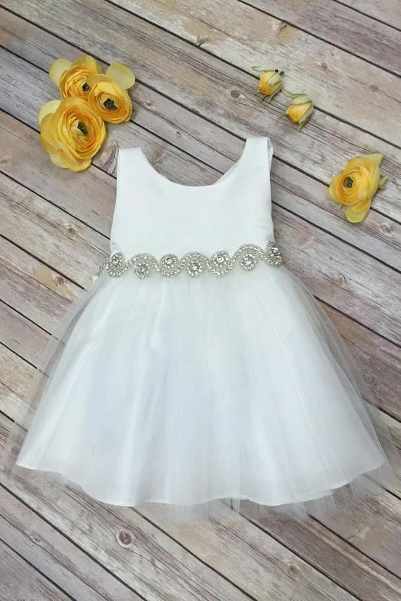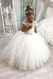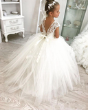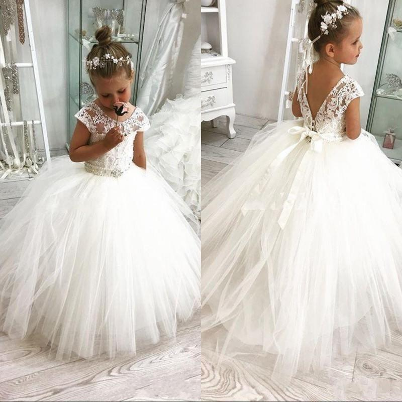 Anneprom White Ball Gown Flower Girl Dresses For Weddings Jewel Backless Short Sleeve Kids Dresses APF0001