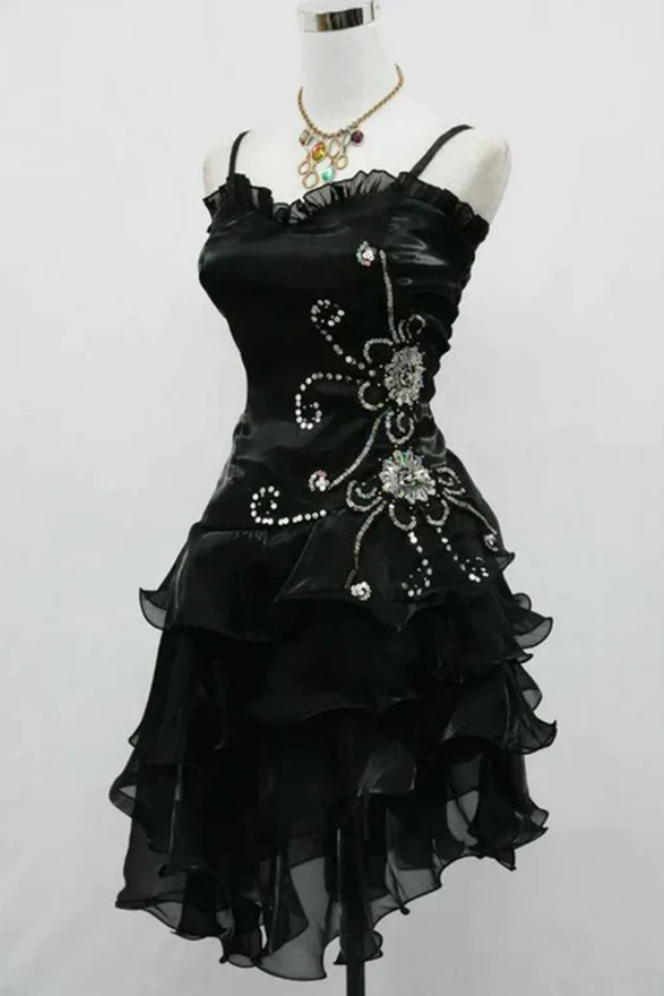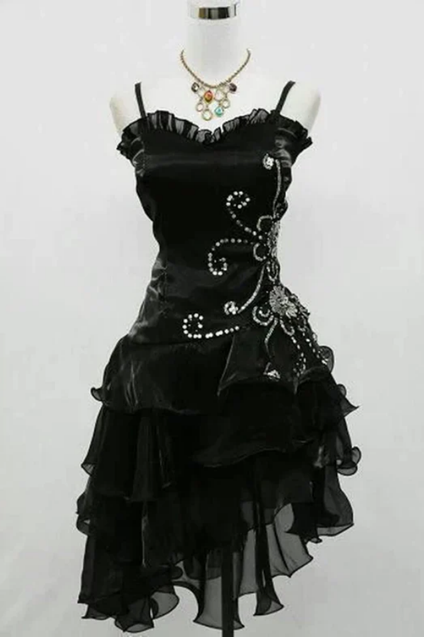 Black Organza Beaded Straps Short Party Dress, High Low Formal Dress APH0348