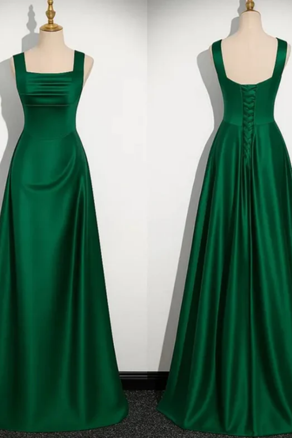 Green Satin Straps Long Evening Prom Dress, A Line Floor Length Formal Dress APP1242