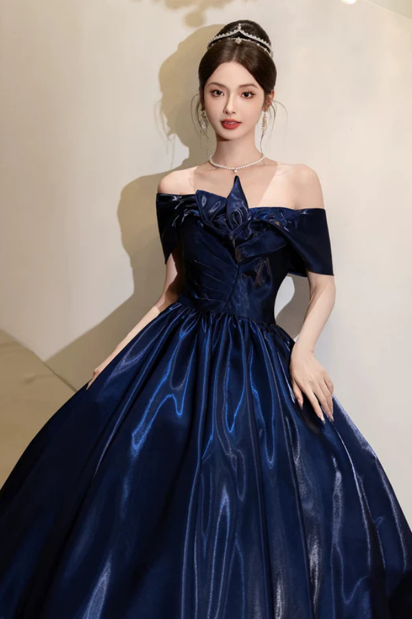 Navy Blue Off Shoulder Satin Floor Length Prom Dress, Sweetheart Evening Dress APP1234