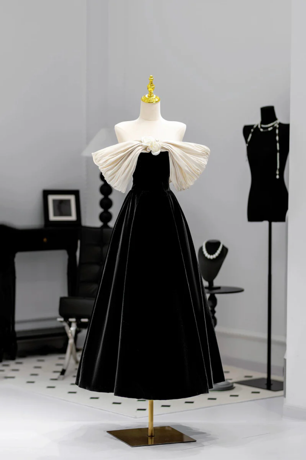 White and Black Velvet Tea Length Prom Dress, A Line Off the Shoulder Party Dress APP1238