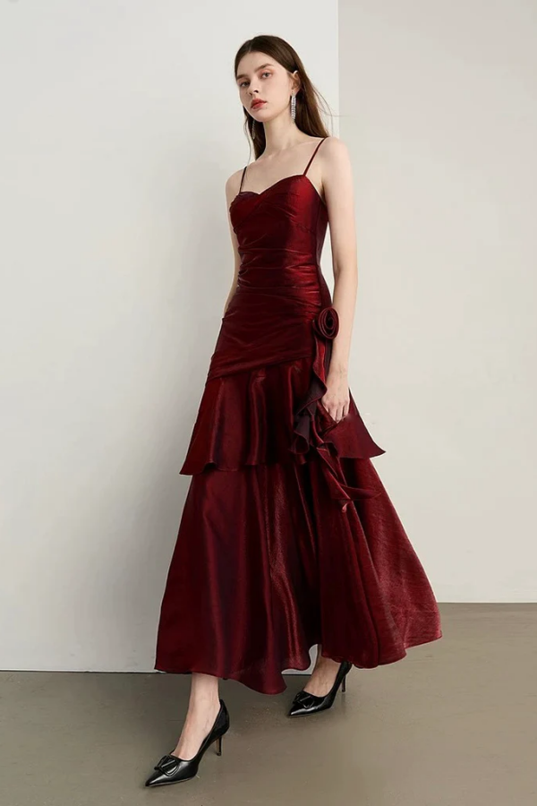 A Line Sweetheart Neck Satin Tea Length Burgundy Party Dress APP1281