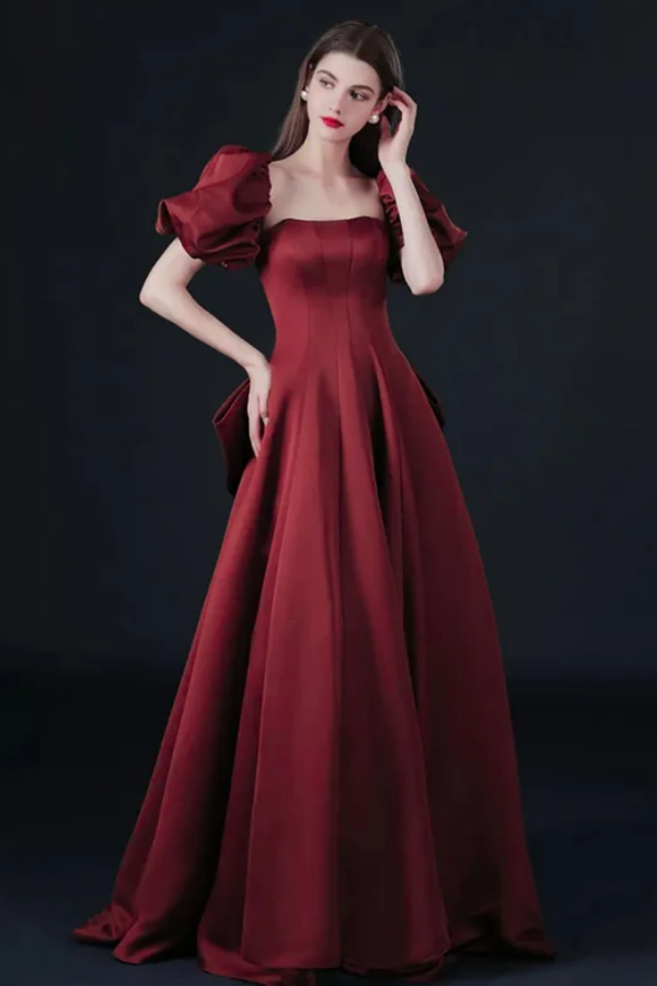 Wine Red Short Sleeves Scoop Long Party Dress, A Line Satin Prom Dress APP1288