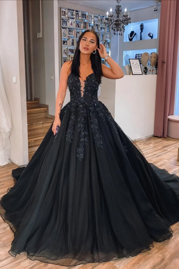 Black V Neck Lace Long Ball Gown, A Line Evening Party Dress APP0944