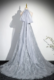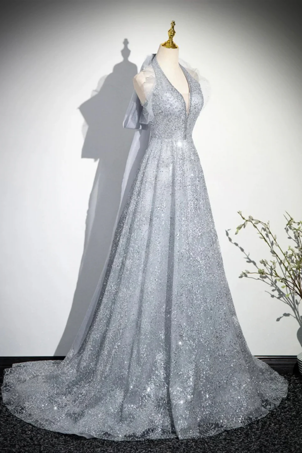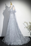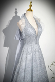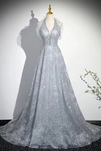Elegant V Neck Tulle Sequins Long Prom Dress, Gray A Line Backless Party Dress APP1131