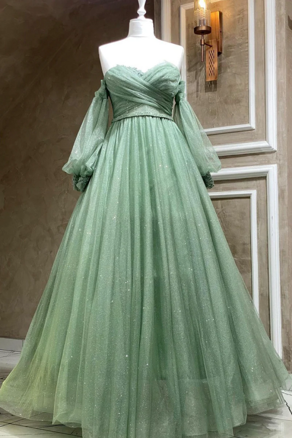 Green Strapless Tulle Long Sleeve Prom Dress, Green A Line Evening Party Dress APP0791