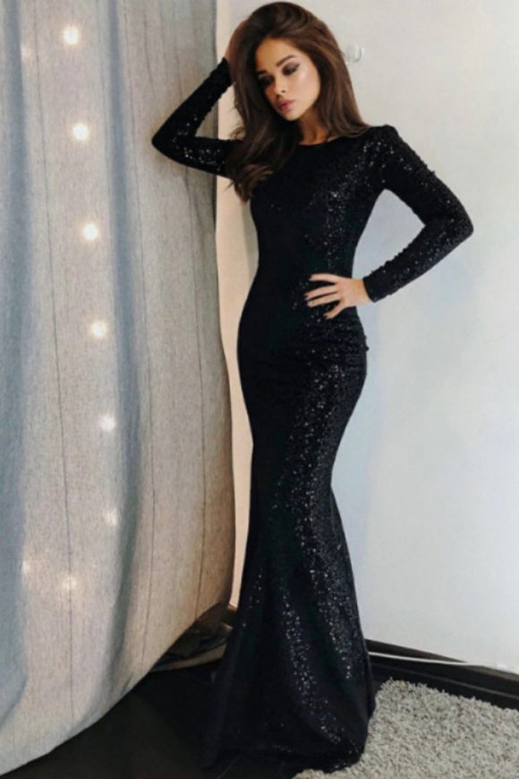 Mermaid Long Sleeves Black Sequined Evening Dress APP0738