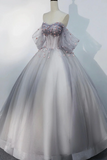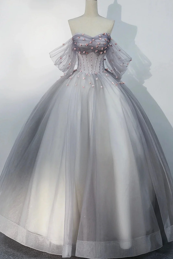 Grey Tulle Sweetheart Flowers Formal Dress, Off the Shoulder A Line Prom DressAPP1104