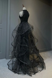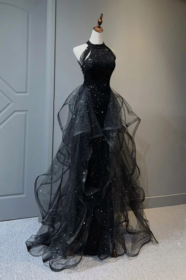 Black Shiny Tulle Long Party Dress with Beaded, Black Evening Dress APP0795