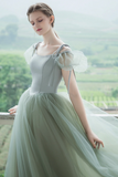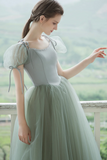 Cute Tulle Long Prom Dresses, A Line Short Sleeve Graduation Dresses APP0969