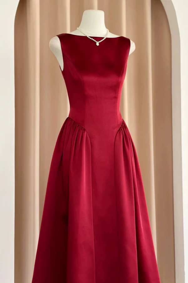 Wine Red Satin Tea Length Wedding Party Dress, Party Dress APH0323