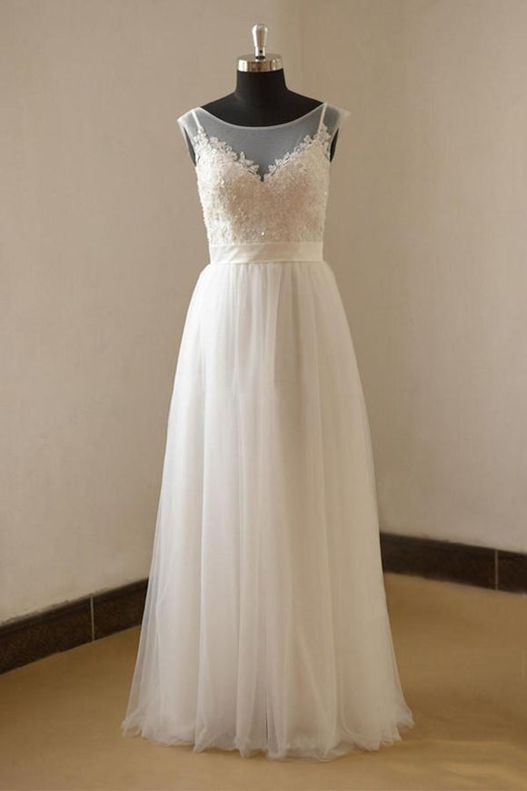 Anneprom Tulle Scoop Neckline A-Line Wedding Dress With Lace Appliques APW0070