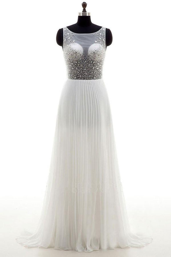 Anneprom A-Line Wedding Dress Bateau Chiffon Sweep Train Backless Beading APW0080