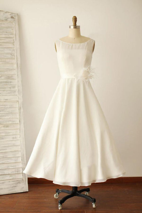 Anneprom Ivory Illusion Boat Neck Tea Length Sleeveless Wedding Dresses APW0083