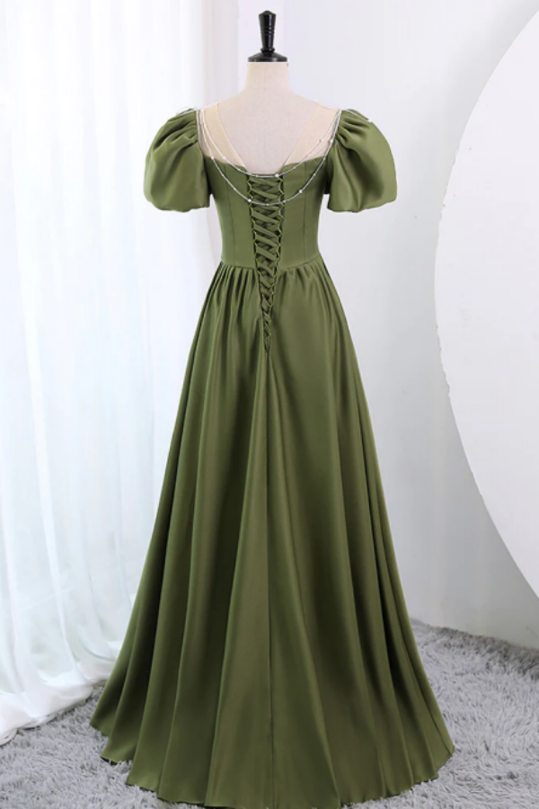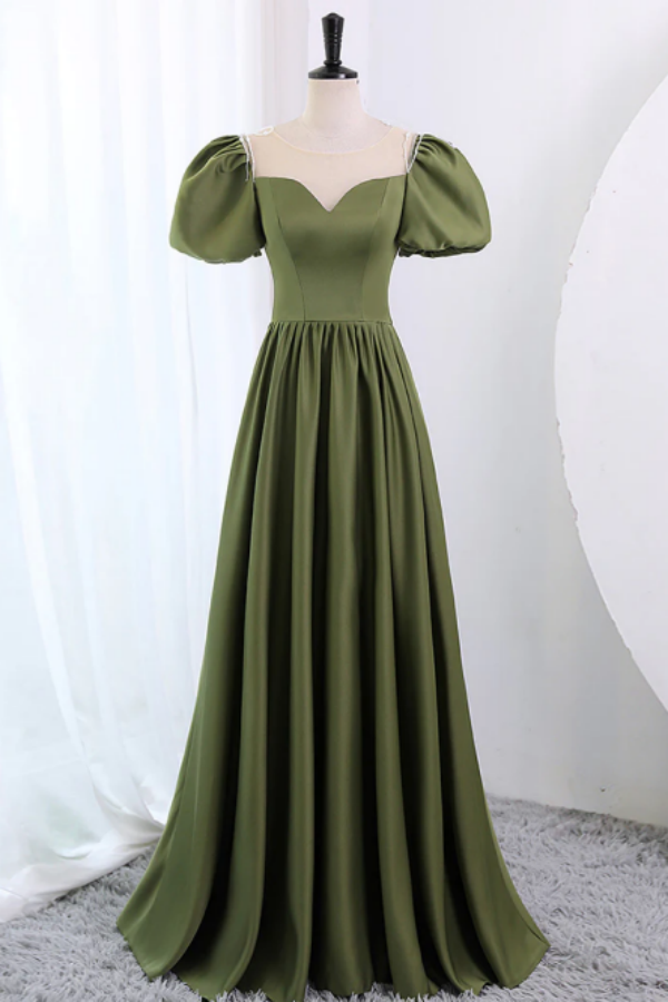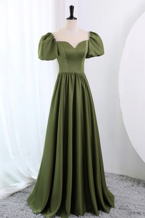 A Line Scoop Neckline Puff Sleeves Satin Long Green Prom Dress, Green Formal Dress APP0822
