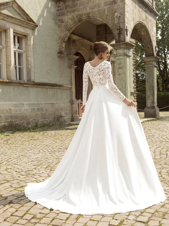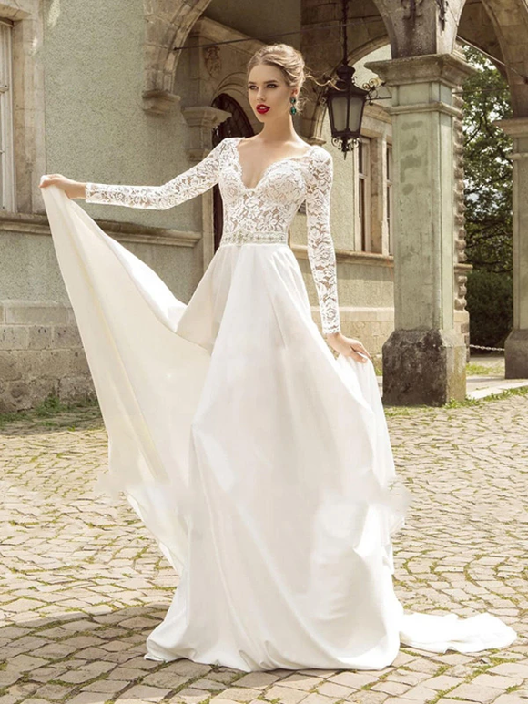 Anneprom A-line Ivory Beach Wedding Dress Sweep/Brush Train V neck Lace Long Sleeve Wedding Dress APW0298