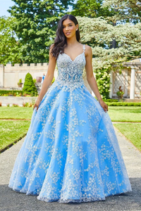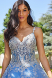 Anneprom Chic A line Spaghetti Straps V neck Long Prom Dress Tulle Applique Evening Dress Formal Dress APP0535