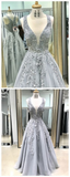 Anneprom Chic A line Straps Lace Prom Dresses Silver Applique Long Prom Dress Evening Dress APP0653
