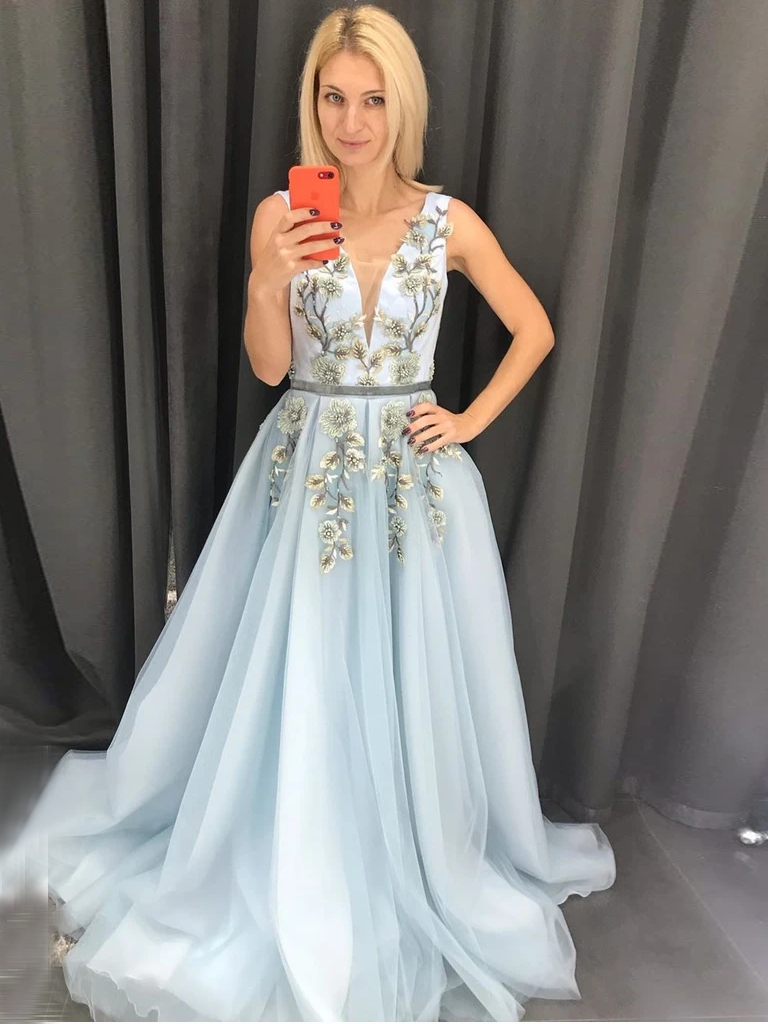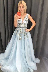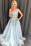 Anneprom Chic A-line V neck Long Blue Lace Prom Dresses Evening Dress APP0446