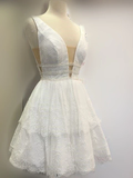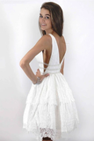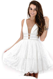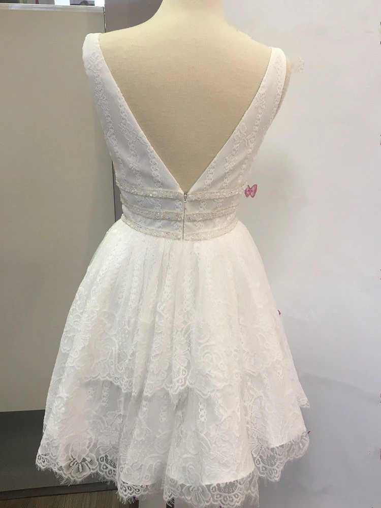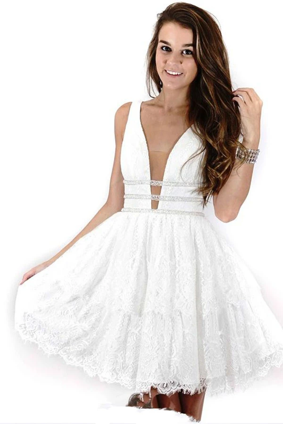 Anneprom Deep Neck Short Prom Dress White Lace Homecoming Dress APP0166