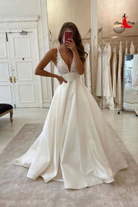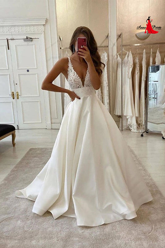 Anneprom White v neck satin lace long prom dress evening dress APW0367