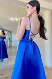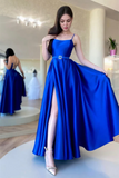 Backless Royal Blue Satin Long Prom Dress with High Slit, Blue Formal Dress APP0710