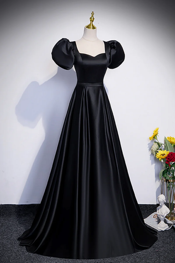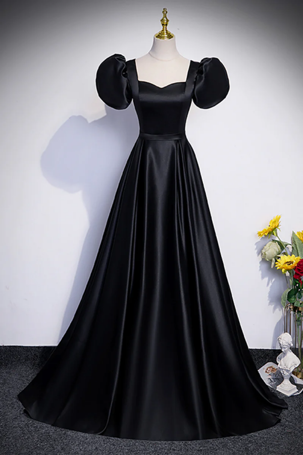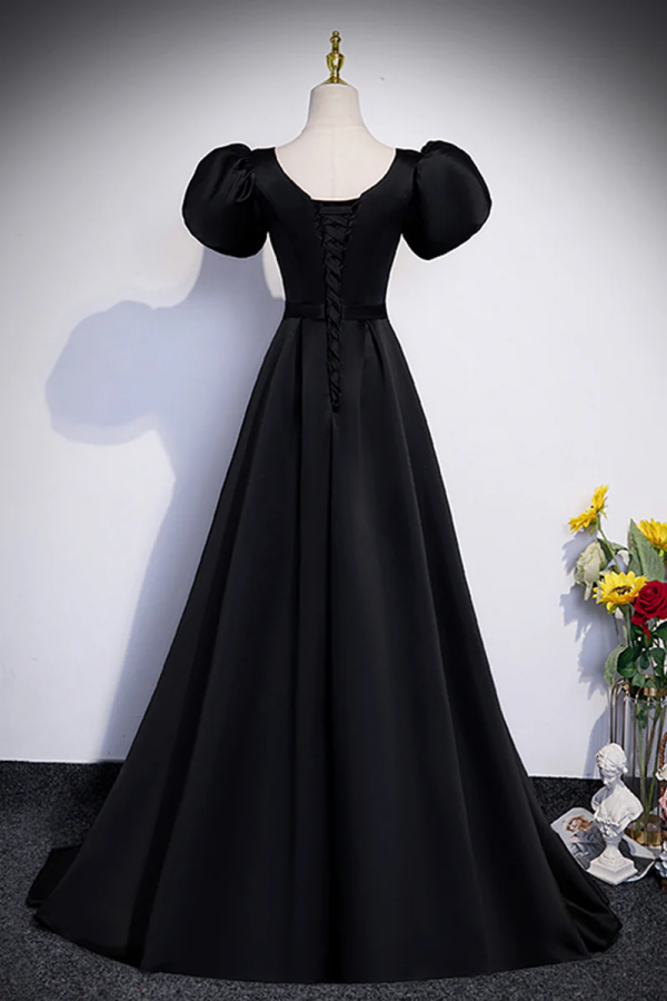 Black Satin Floor Length Prom Dress, Simple Black Short Sleeve Evening Dress APP0853