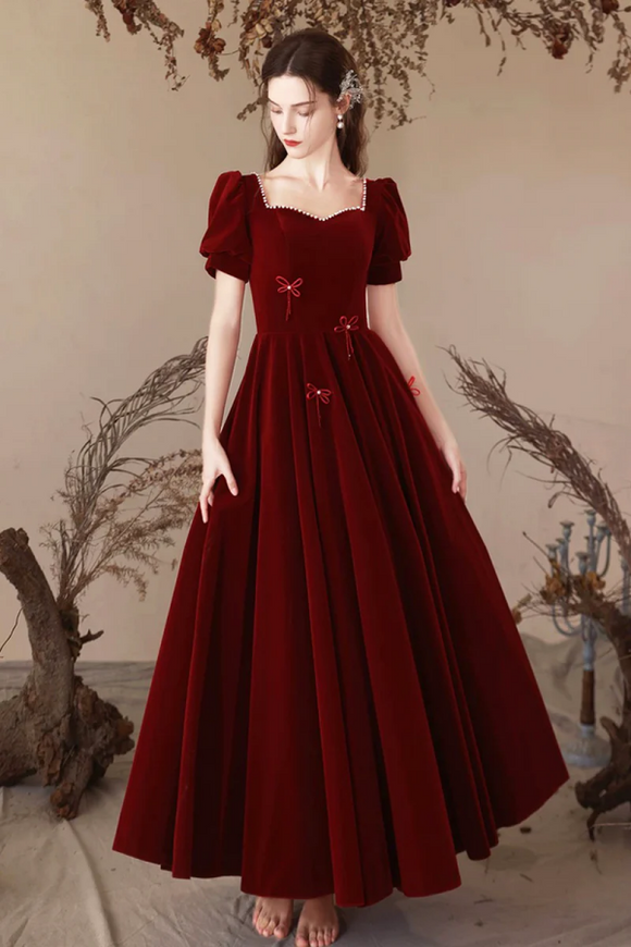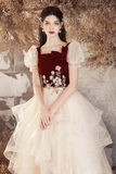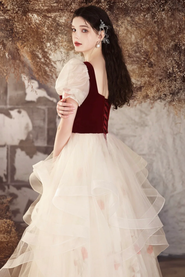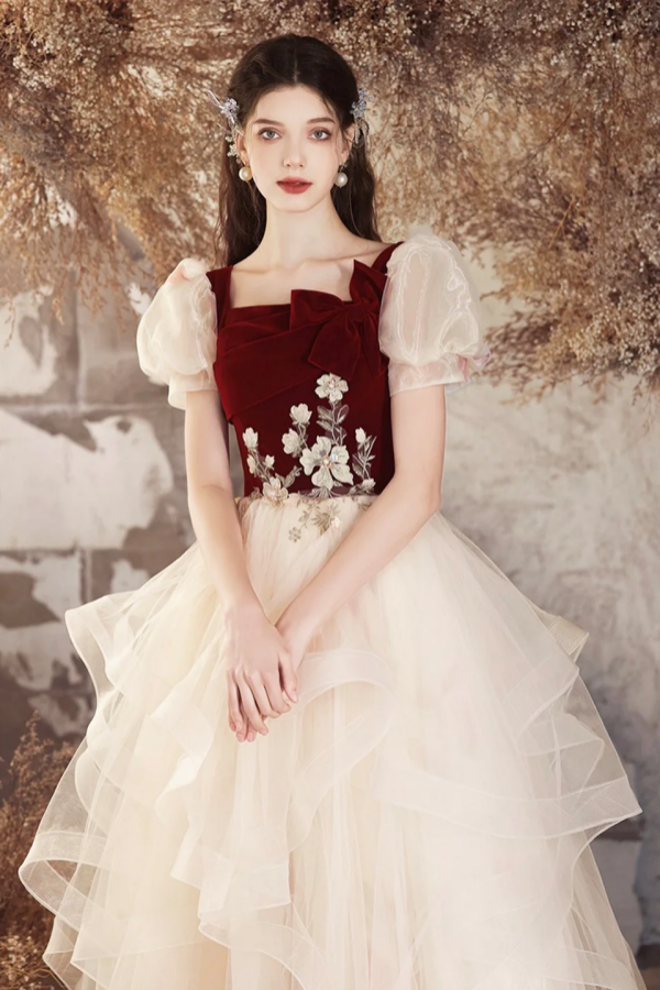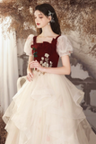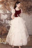 Burgundy Velvet and Champagne Tulle Long Prom Dress, Lovely A Line Short Sleeve Evening Party Dress APP0926