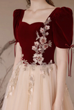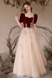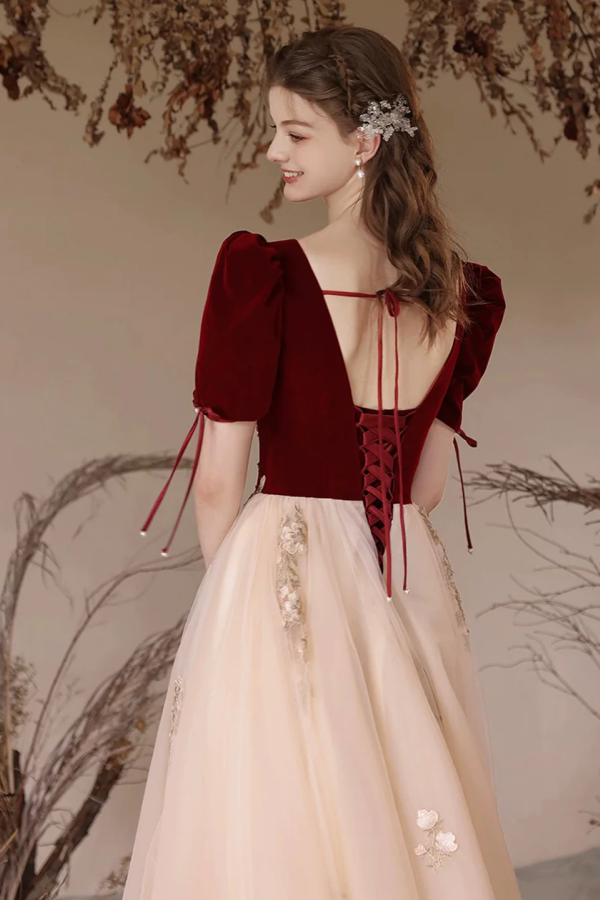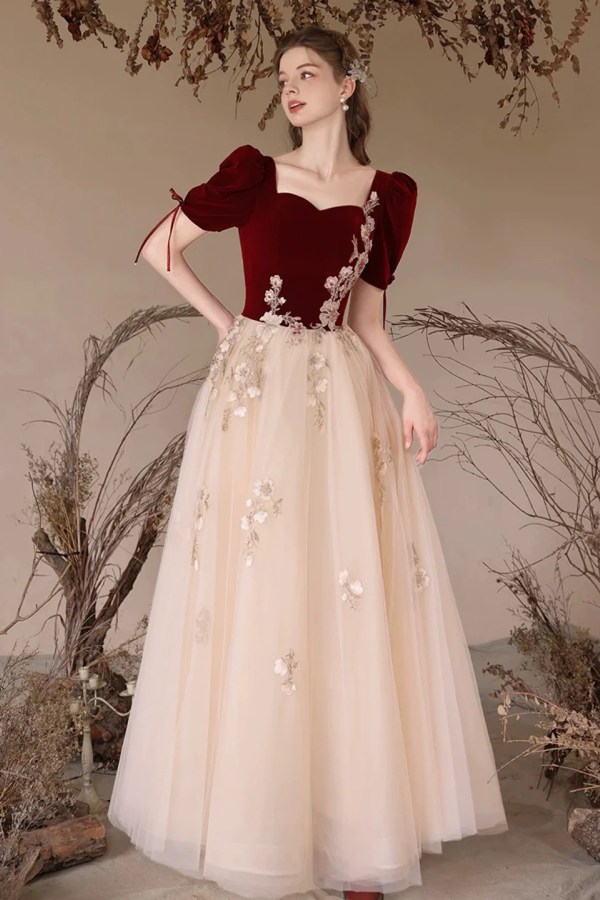 Burgundy Velvet and Tulle Long Prom Dress, Elegant A Line Short Sleeve Evening Dress APP1031