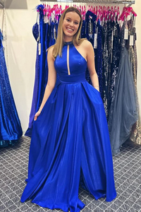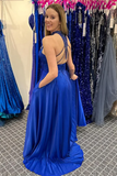 Halter Neck Beaded Royal Blue Satin Long Prom Dress, Royal Blue Formal Graduation Evening Dress APP0746