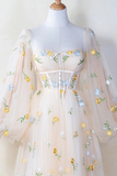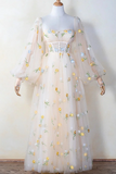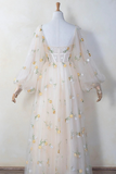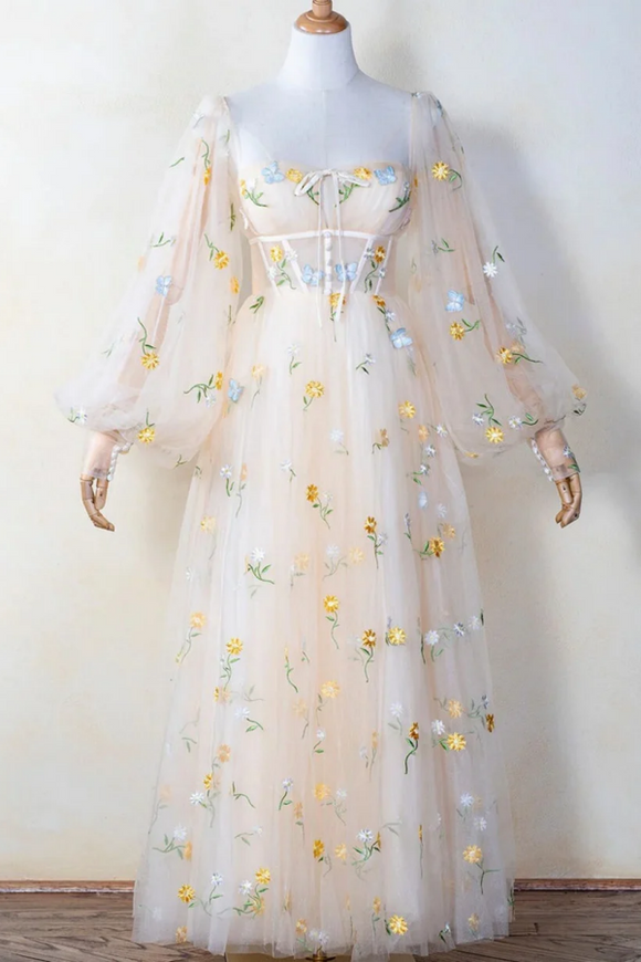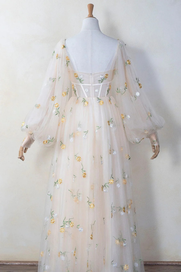 Light Champagne Floral Tulle Long Party Dress, A Line Long Sleeves Prom Dress APP0870