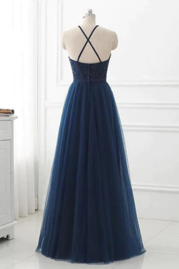 Navy Blue Tulle A Line Lace Appliques Halter Long Prom Dress, Party Dress APP0766