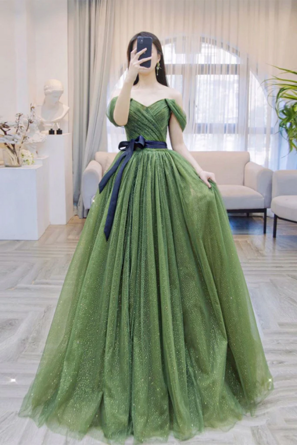 Shiny Tulle Off Shoulder Green Long Prom Dress, Off the Shoulder Formal Dress, Green Evening Dress APP0749