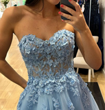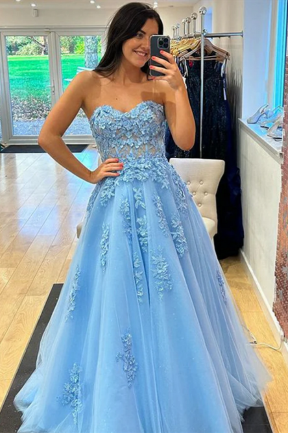 Sweetheart Neck Light Blue Lace Prom Dresses Long, Formal Evening Dresses APP0717