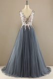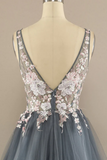 V Neck Ball Gown Tulle Prom Dress Floral Lace Party Dress APP0699